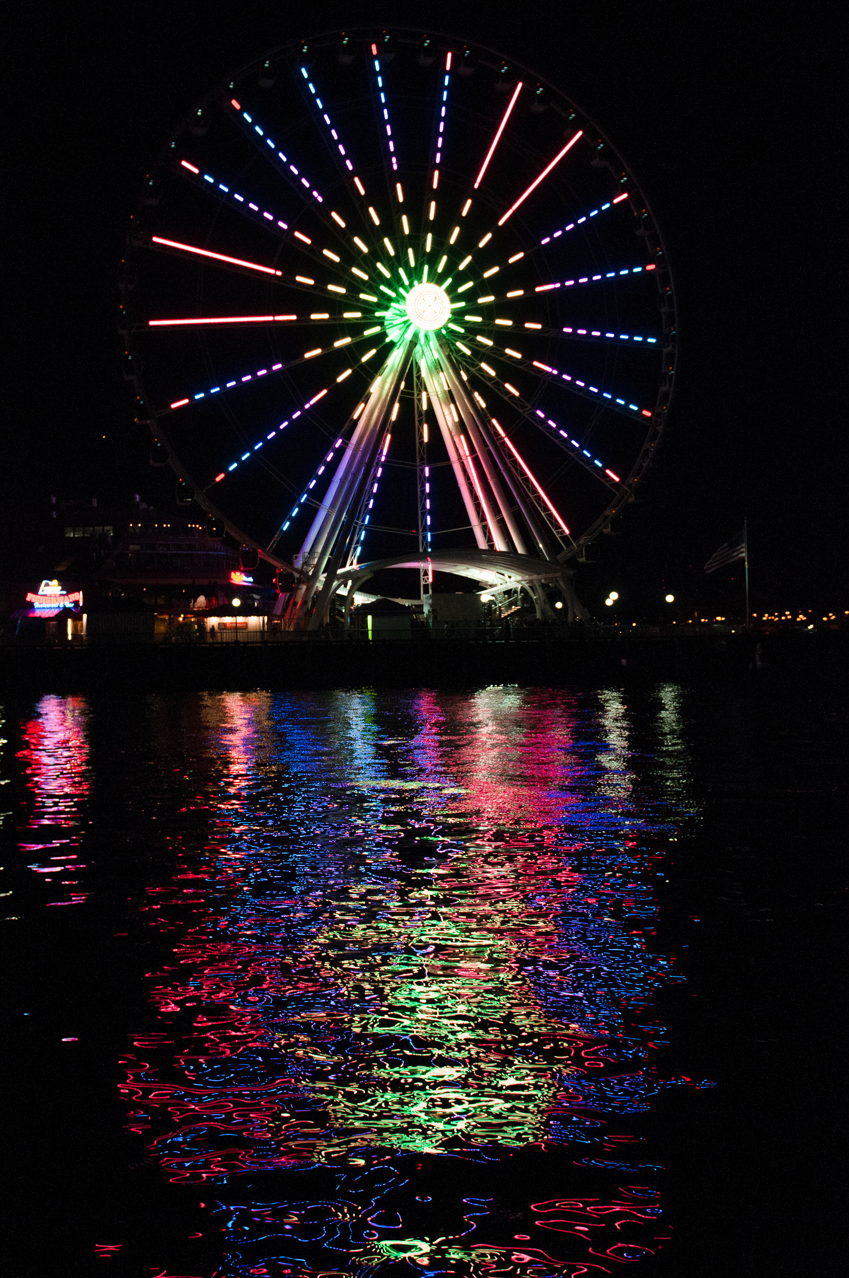 Reflections of the Seattle Great Wheel at night.